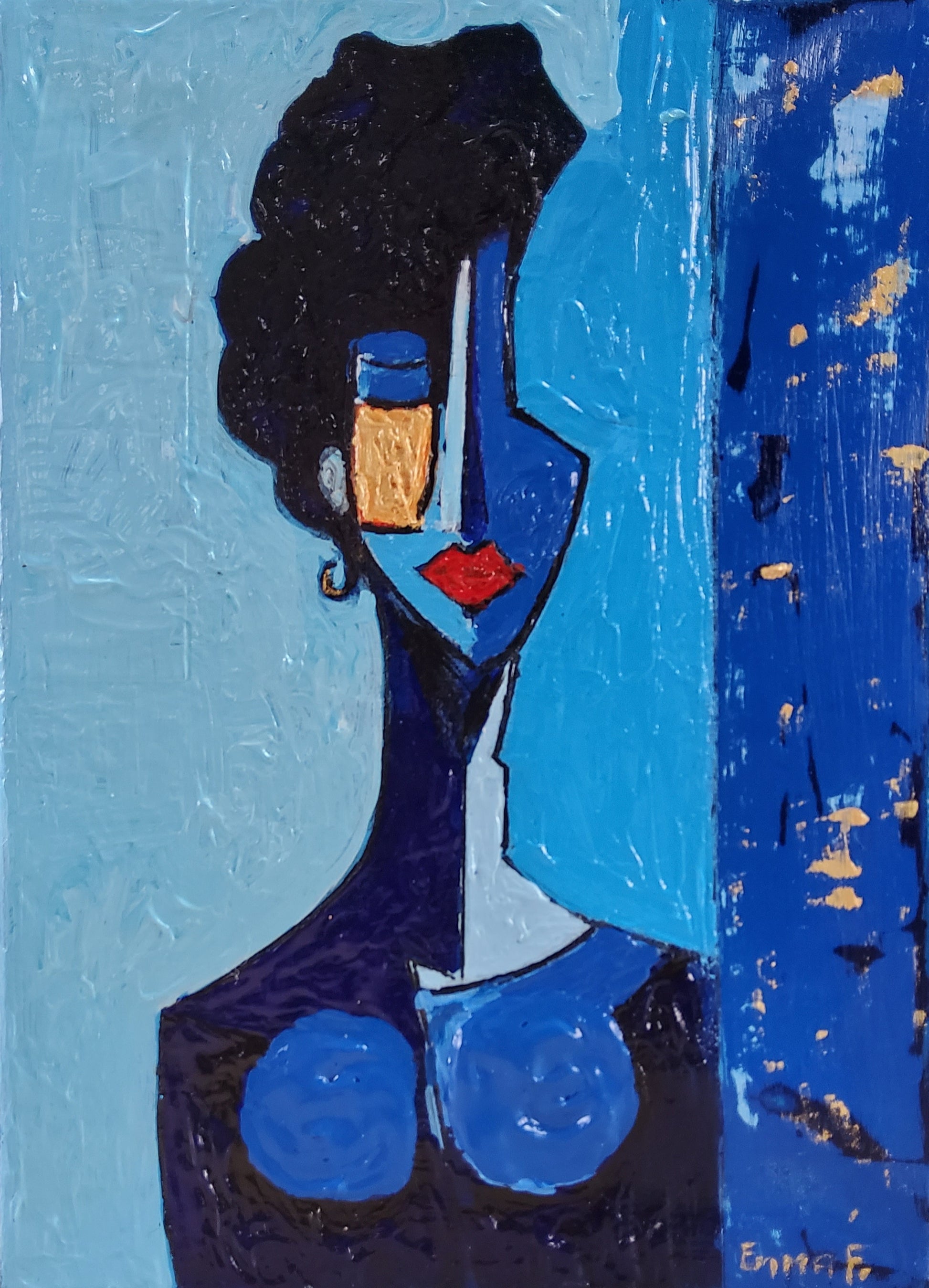 Son regard fragmenté, sa bouche rouge et sa ligne dorée traduisent une beauté vibrante, presque numérique.