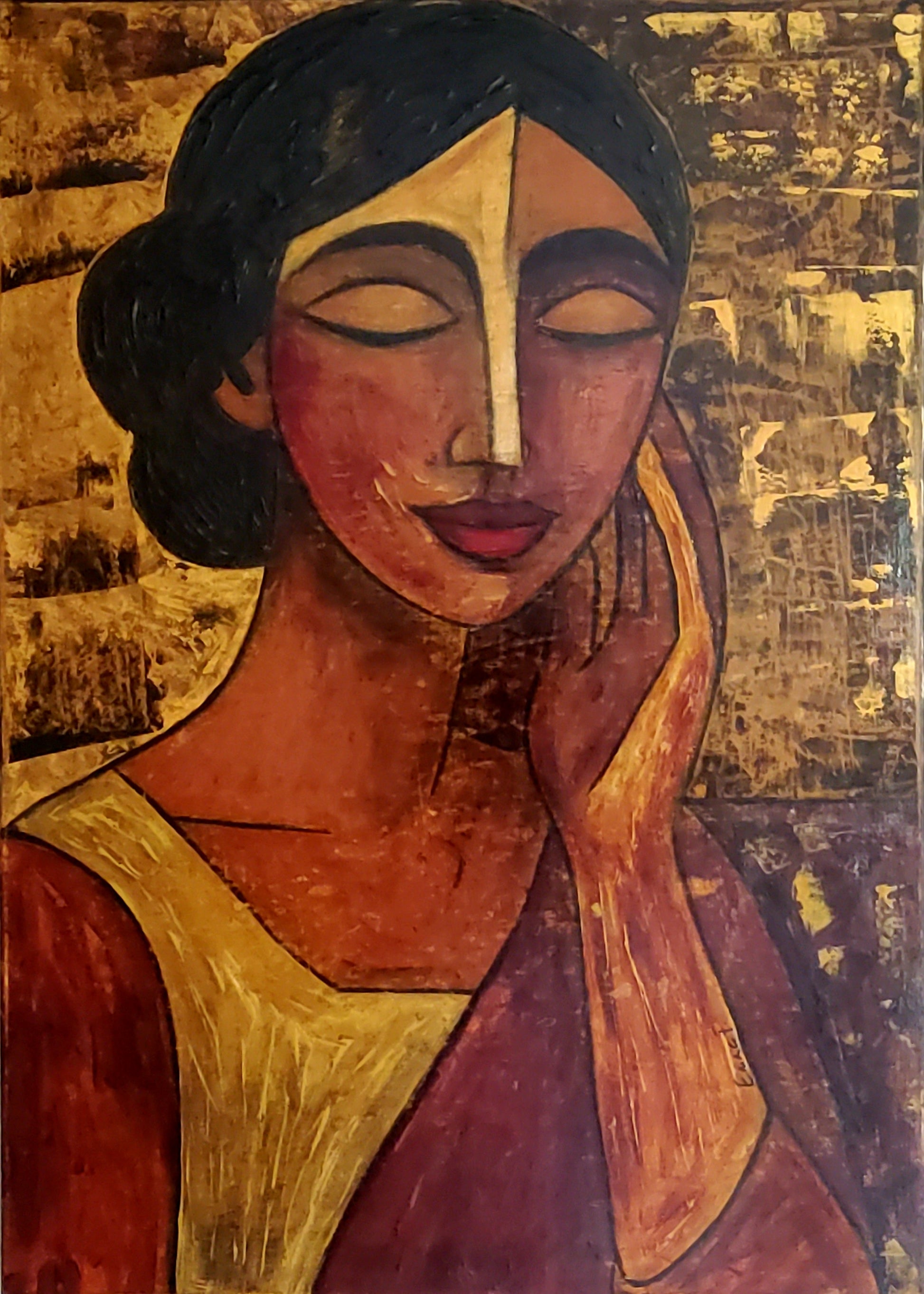 Figure de silence et d'intériorité, Présence II fait dialoguer force calme, mystère et lumière intérieure. La géométrie du visage et les matières chaudes créent une présence à la fois incarnée et contemplative.